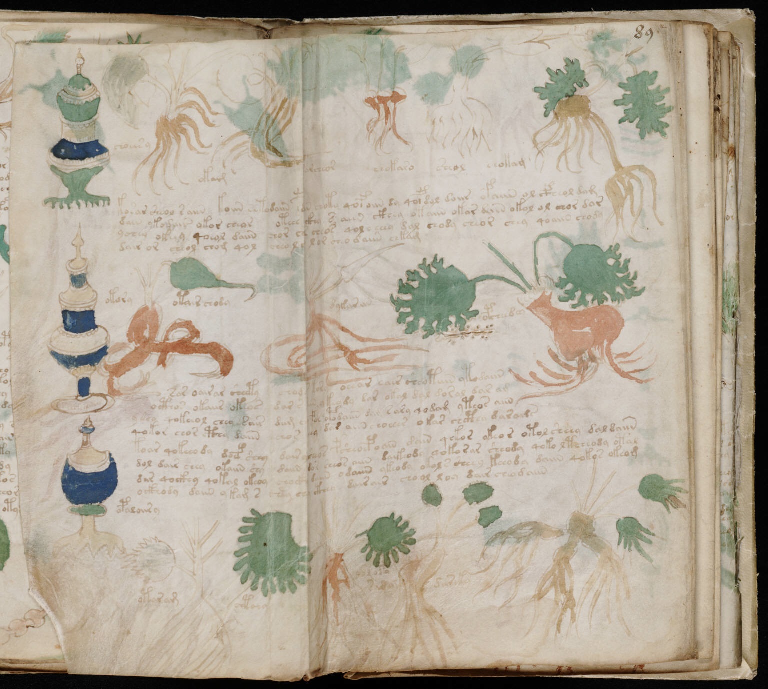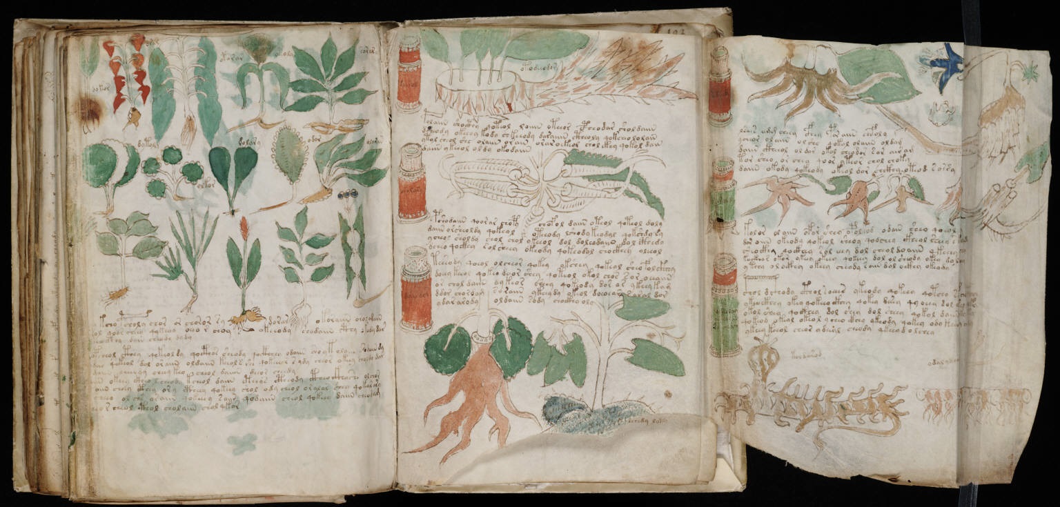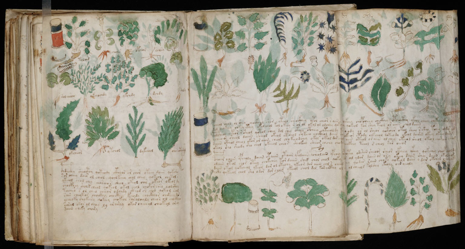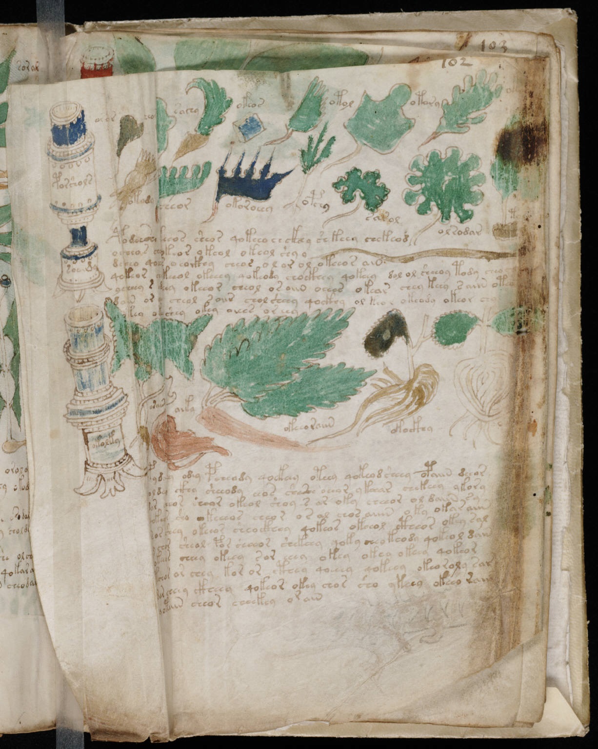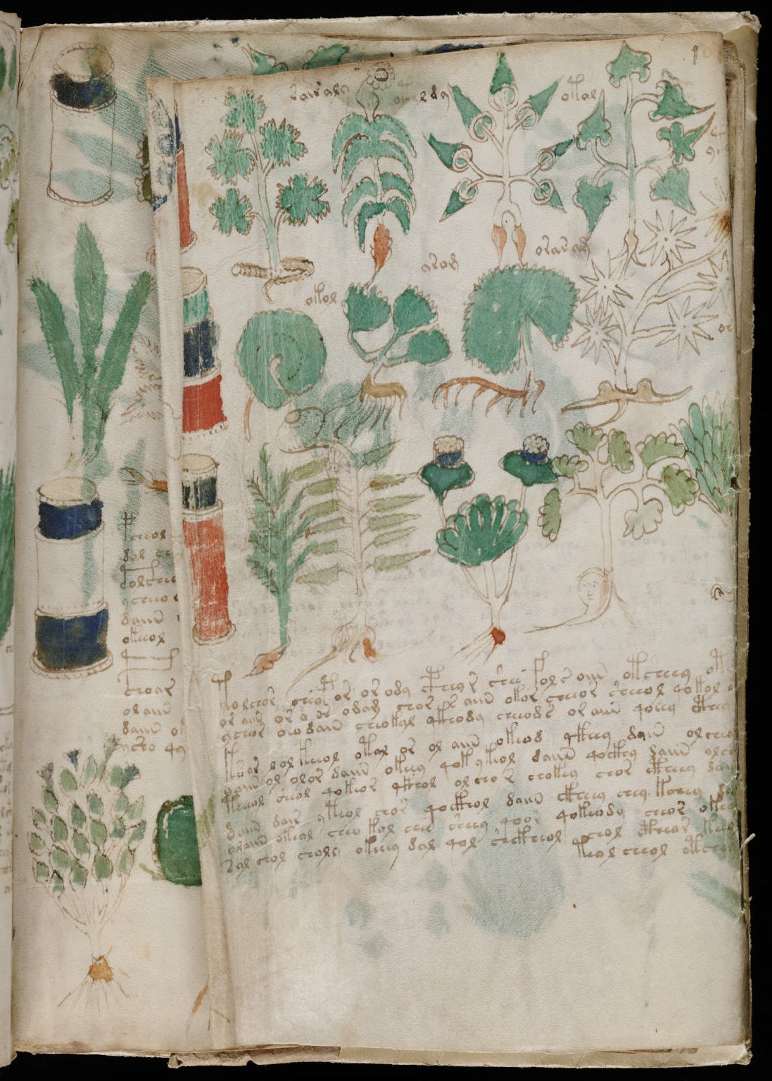 Здесь рисунки частей растений с изображениями аптекарских сосудов на полях страниц.